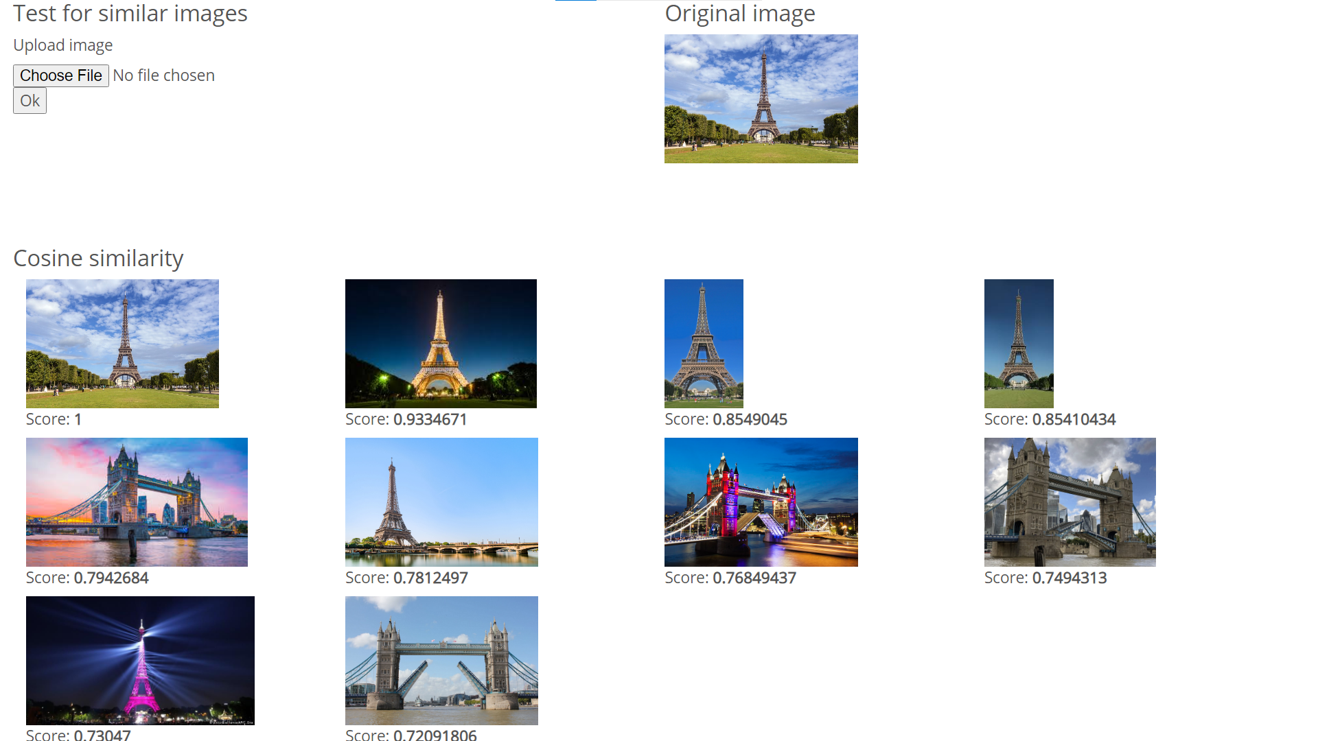4. Searching. When the user uploads the image we're using the same DNN to extract the feature vector from it and compare it to the others stored in Elasticsearch. One important thing here is to properly define the threshold for accurate results. By trial and error I found that in my case the most accurate results are when setting the threshold to the mean of the minimum and maximum score.